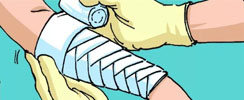 人字形包扎用于能彎曲的關節,如肘部、膝部,還有手和腳跟,方法如下: ·先將繃帶在患者肢體關節中央處纏繞一圈做固定,然后繞一圈向下,再繞一圈向上,反復向下、向...